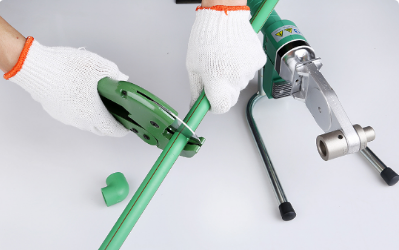 2、用PPR專用剪刀將PPR管裁剪好尺寸,切割PPR管材必須使端面垂直于管軸線。
